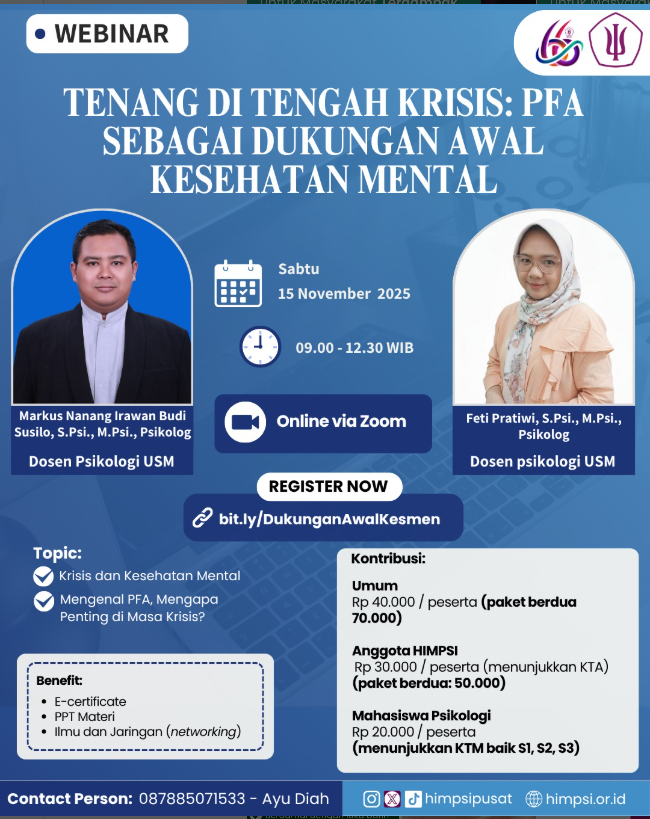 Webinar; Tenang Ditengah Krisis; PFA sebagai dukungan Awak Kesehatan Mental